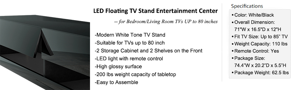 - 【Modern & Minimalism】 Promotion! This high-glossy 70 inch floating tv stand with lights features an RGB LED lights system for up to 85-inch TV screens, which can not only save a lot of space in the living room but also look more modern and luxurious. Suitable for most home decorations and various styles, it will add a touch of classiness and vitality to your bedroom, living room, media room, etc.