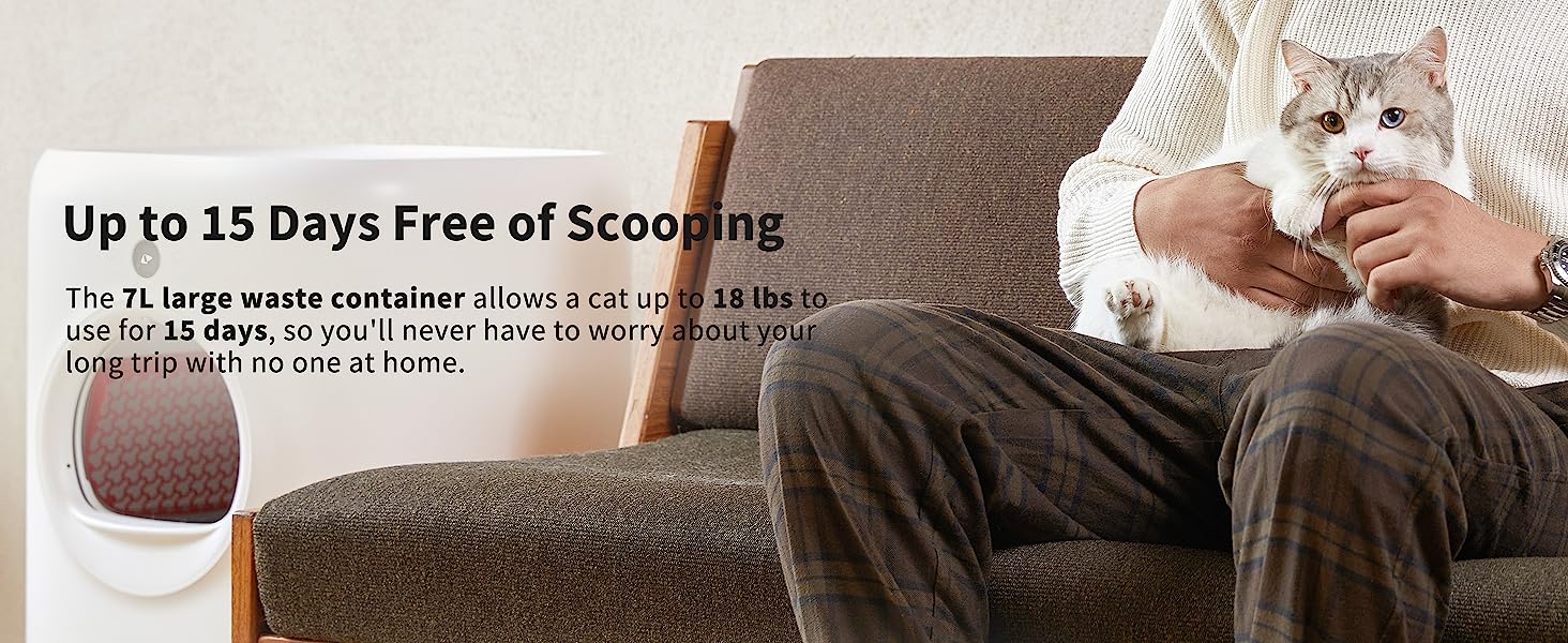 - 【LARGE CAPACITY FOR MULTIPLE CATS】The self cleaning litter box is suggested for the cats who weigh up to 18lbs. The max cat litter is 5L, waste collection bin capacity is 7L. It allows up to 15 days no scooping for one cat. This rotating auto clean cat litter box could reduce your cleaning work highly