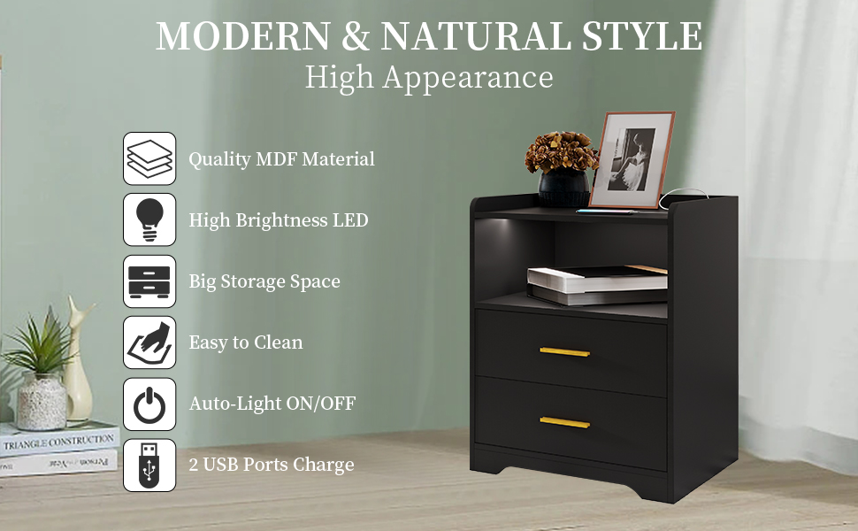 【Furniture】Black Nightstand with Charging Station, Night Stands with 2 Drawers, Smart Nightstand Bedside Table Led