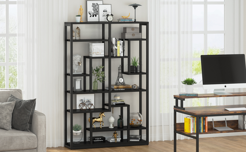 【Furniture】Black Bookshelf 47” Bookcase 9 Tier Tall Book Shelf Rustic Geometric Bookcase Display Shelf Organizer